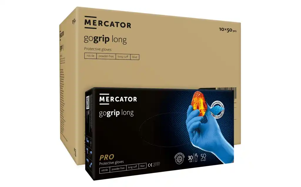 MERCATOR gogrip long gloves are 3 times thicker than standard thin nitrile gloves*. Made from flexible and durable nitrile, they feature a 3D diamond texture that makes your grip strong and stable even when handling wet and oily products. The 30 cm cuff protects not only the hands but also part of the forearm, thus preventing liquids from entering the glove. The inside of the glove has been designed to reduce hand perspiration and improve comfort. Work like a pro - with the MERCATOR gogrip you can operate touchpad devices with ease.