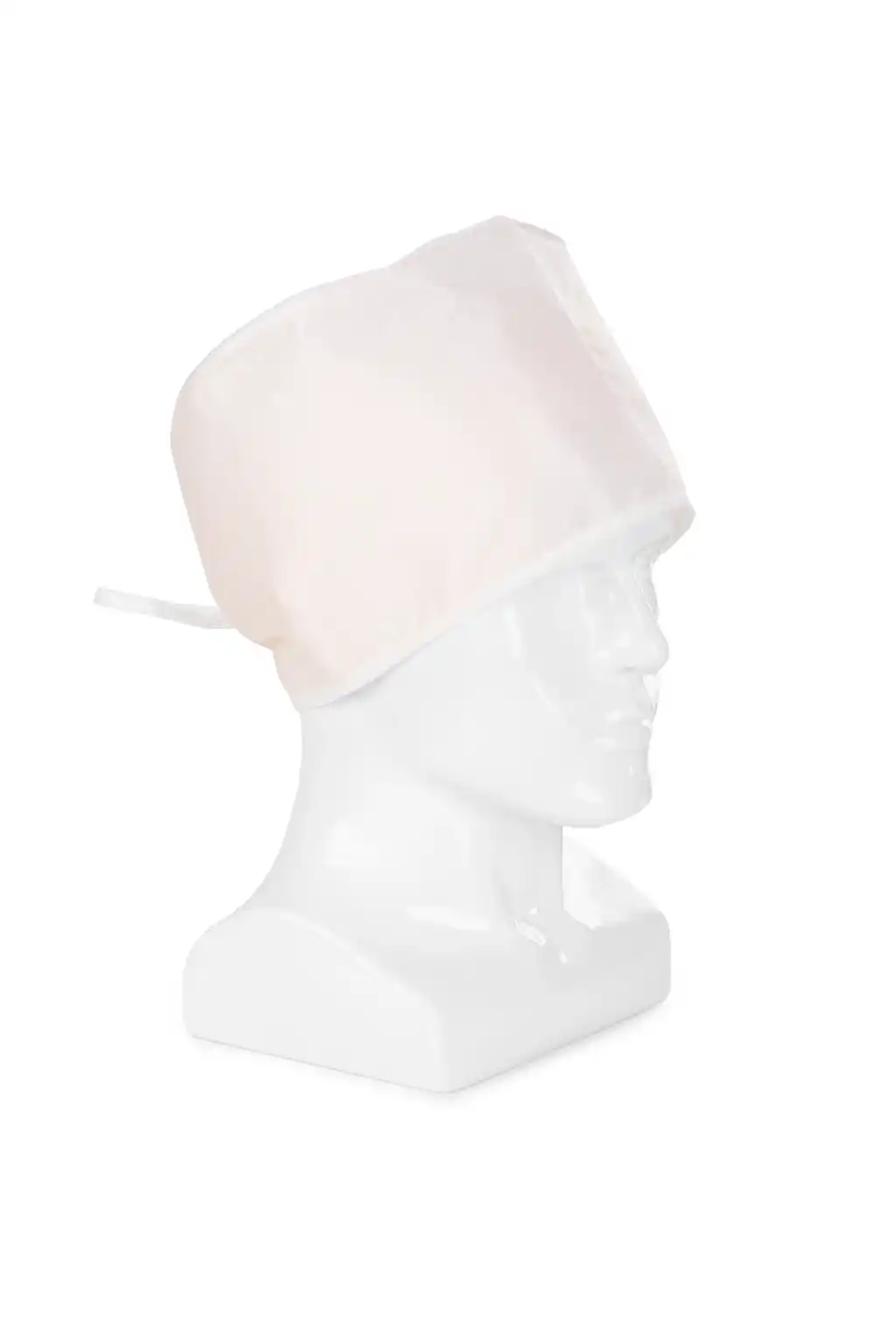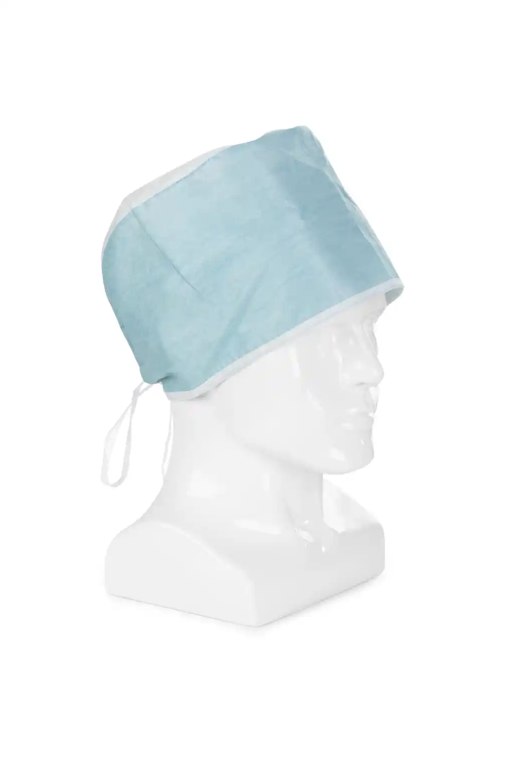 z włókniny Spunlace, czepek typu furażerka wiązany na troki, gramatura 45 g/m². Czepek wyższy od standardowego czepka. Wyrób pakowany w kartonik z perforowanym otworem ułatwiającym wyciąganie pojedynczego czepka. 100 sztuk w opakowaniu.