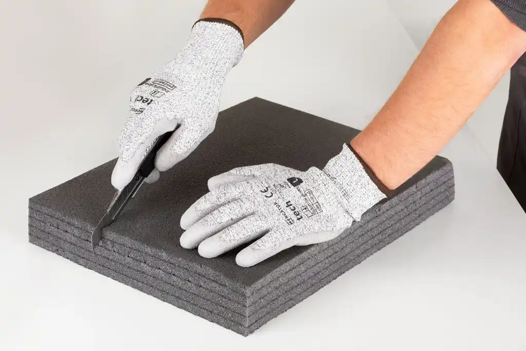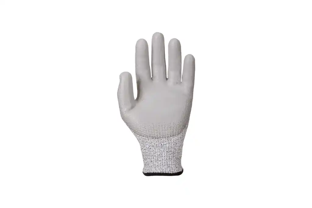 Rękawice robocze antyprzecięciowe z materiału HPPE w kolorze szarym, powlekane szarym poliuretanem. Rękawice w workach zbiorczych po 12 par.