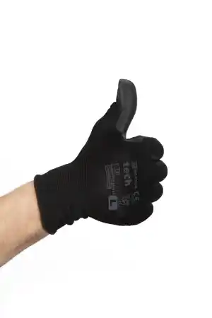 Rękawice robocze poliestrowe w kolorze czarnym, powlekane poliuretanem w kolorze czarnym. Rękawice w workach zbiorczych po 12 par. Środek ochrony indywidualnej kat II. Bezszwowa dzianinowa część rękawicy dopasowuje się do dłoni użytkownika oraz pozwala na swobodny przepływ powietrza poprawiając komfort pracy i ograniczając pocenie się dłoni. Syntetyczne pokrycie wzmacnia wewnętrzną część rękawicy zwiększając ich trwałość i odporność na przetarcia.